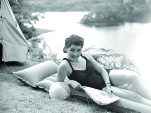 A lady lying on a lilo wearing a swimming costume and holding a copy of ‘Illustrated’ (2002_8_1662)