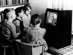 Early Television Prints : Children gathered around Television Set watching Andy Pandy : 1950