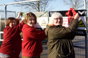 Protesters against Yorkshire fracking decking the site gates with Chrismas decorations – Carol Towner is on the left 2_bigissuenorth