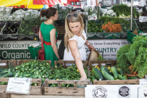 Marylebone Farmers’ Market, customers buying organic vegetables. British food market. British produce.