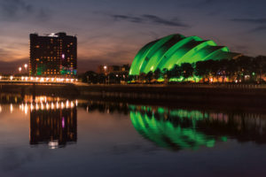 View of the SEC Armadillo lit up in green